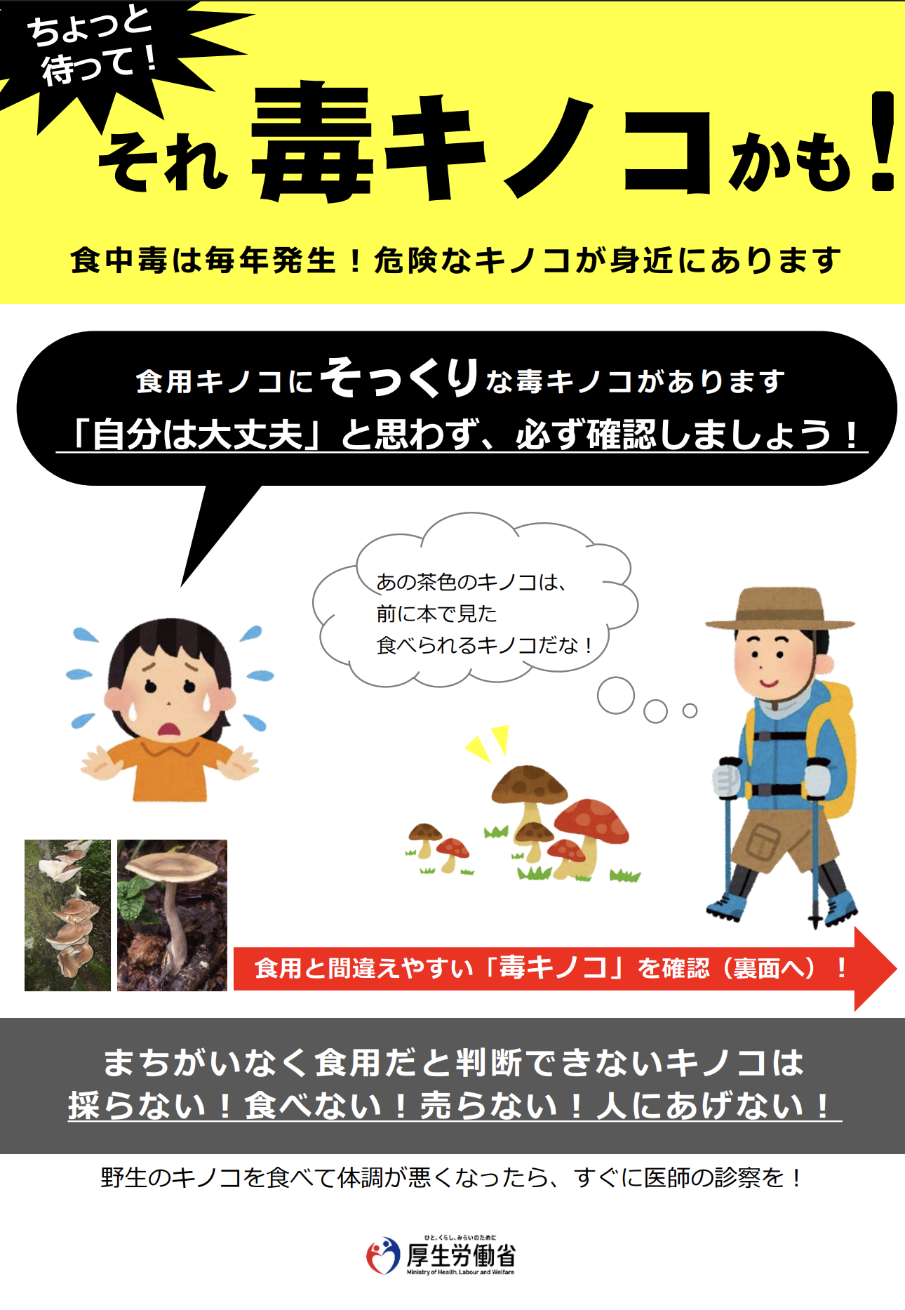 キノコ狩りや山菜採りなどで毒のあるキノコや山菜などにご注意を! うっかり食べると食中毒に