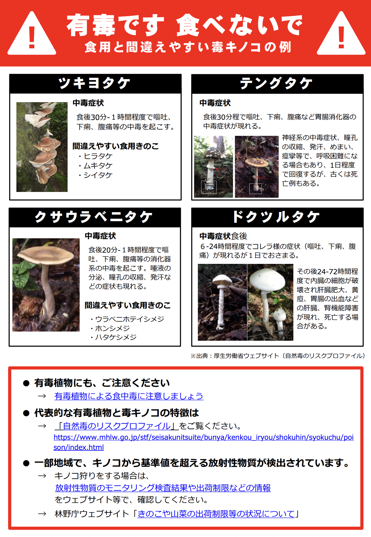 毒キノコによる食中毒予防は、採らない!食べない!売らない!人にあげない!